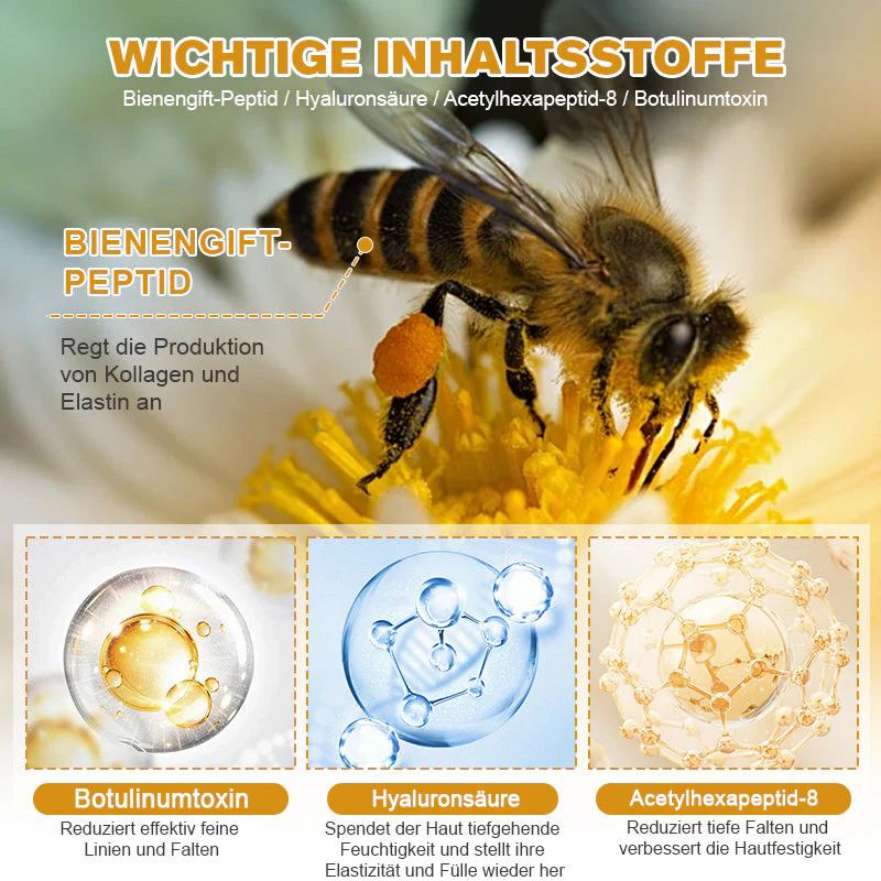 Die Creme nutzt die Wirkung von Bienenvenom-Peptiden, die die Wirkung von Botox nachahmen und Ihre Gesichtsmuskeln entspannen. Dies hilft, die Bildung von Ausdruckslinien zu reduzieren und sorgt für ein glatteres, strafferes Hautbild.