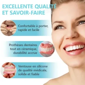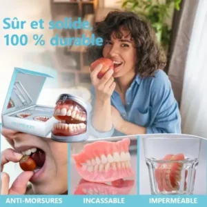 🌟 Ajustement Facile, Confort Absolu : Profitez de dentiers qui s’adaptent parfaitement à votre bouche dès leur mise en place. Grâce à notre conception de pointe, vous bénéficiez d’un ajustement sûr et précis, offrant un confort exceptionnel qui donne l’impression qu’ils font naturellement partie de votre bouche. Vivez votre journée en toute confiance, sans gêne ni déplacement, et profitez de la liberté de manger, parler et sourire sans souci ni contrainte.
