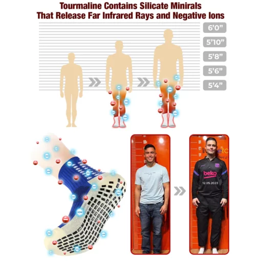 ✅ Bone Growth Promotion: The socks promote bone growth by leveraging the interaction of titanium ions with negative ions. This process increases the spacing between calcium ions, leading to wider and more porous bone trabeculae. It stimulates the generation of new bone cells and supports the growth and elongation of the legs, arms, and spine.