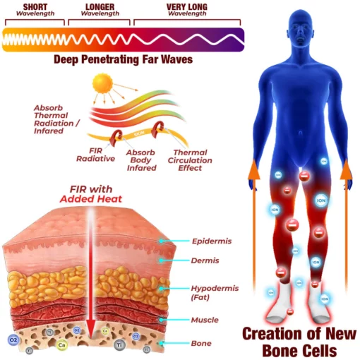 When exposed to far-infrared energy, titanium elements exhibit a robust reaction with negative ions, leading to the dissociation of titanium ions. Within the human body, these ions undergo oxidation when combined with oxygen ions, subsequently bonding with calcium ions to form a novel structure. This process results in an expansion of the gaps between calcium ions, creating wider and more porous bone trabeculae. In response to these gaps, bone cells continuously multiply and grow, generating new bone marrow and bone tissue. This phenomenon is also observed during the healing of bone fractures, where the body generates new bone cells to restore and rebuild the bone structure.