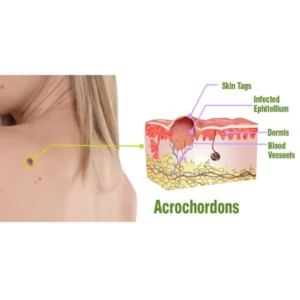 Skin tags, also known as acrochordons, are small, soft, benign growths that protrude from the skin. They typically appear as tiny, flesh-colored or slightly darker skin flaps, often attached to the skin by a thin stalk or peduncle. Skin tags are common, factors such as friction, hormonal changes, genetics, obesity, and insulin resistance may contribute to their formation.