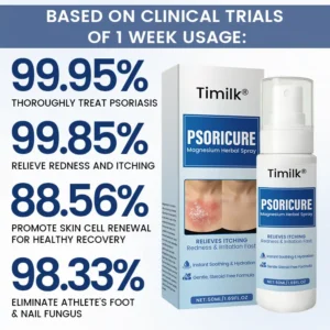 Timilk® PsoriCure Magnesium Herbal Spray penetrates deep into the skin, gently cleansing from within and quickly relieving itching and inflammation caused by psoriasis. This hormone-free, non-irritating formula is safe for sensitive and damaged skin. Timilk® PsoriCure helps regulate excessive skin cell proliferation, soothes redness, flaking, and stinging, and supports the restoration of the skin’s natural barrier—bringing your skin back to balance and health.