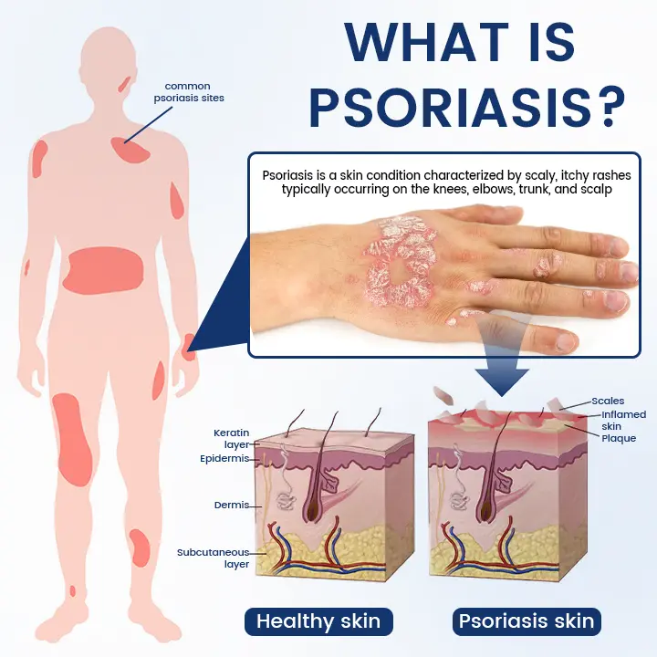 Psoriasis is a chronic autoimmune disease that occurs when the immune system mistakenly attacks healthy skin cells, leading to excessive cell growth and buildup. This causes redness, scaling, and the formation of typical psoriasis plaques, which can appear anywhere on the body but are most commonly found on the scalp, elbows, knees, and lower back.