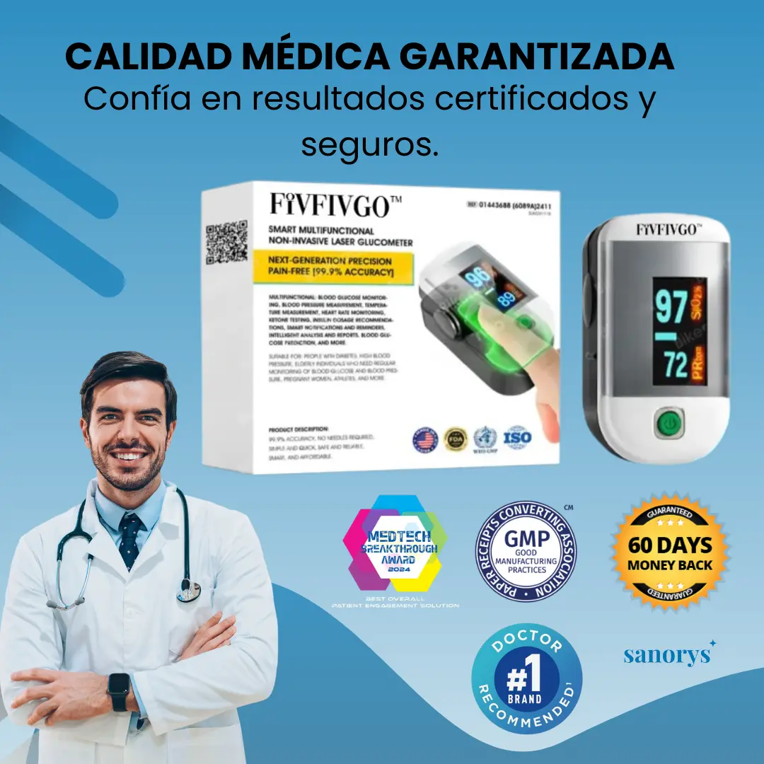 Deja atrás los métodos invasivos y dolorosos. Medidor de Glucosa en Láser – No invasivo – Fivfivgo™ transforma la forma de medir tus niveles de azúcar en sangre con tecnología avanzada que elimina las agujas. Preciso, rápido y sin molestias.