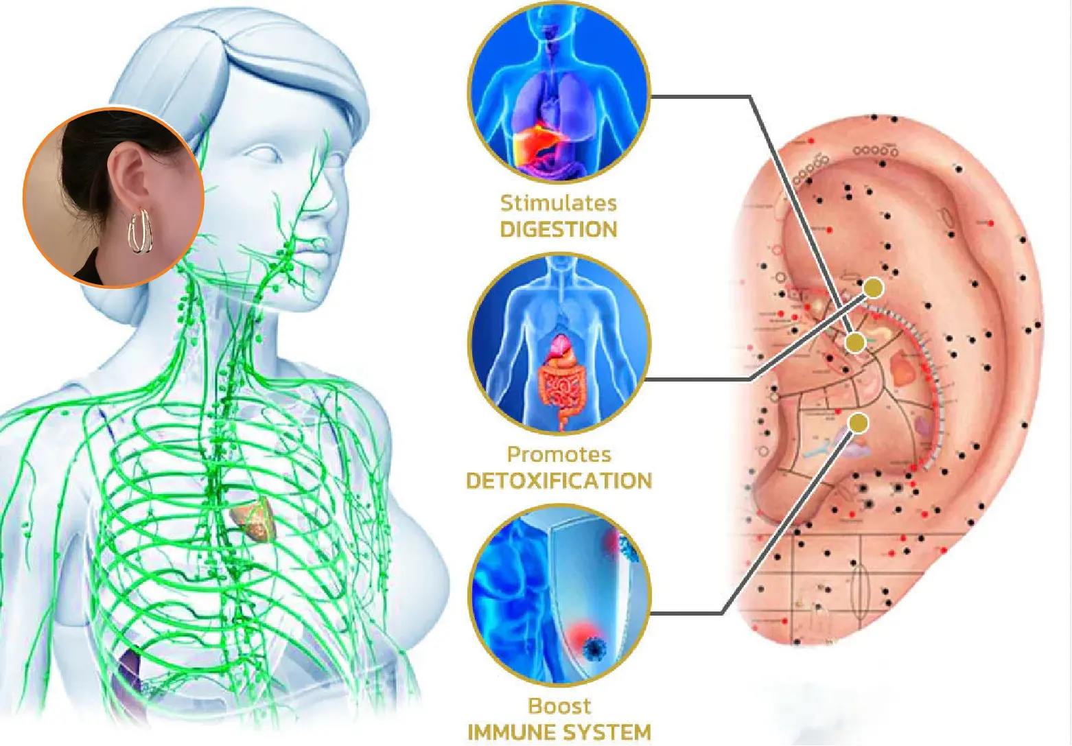 The Miniyou Lymphatic Drainage Earrings offer a natural detoxification solution and contribute to the improvement of blood circulation. Ear acupuncture points support weight loss through various mechanisms, such as regulating hormone production, enhancing metabolism, improving digestion, reducing inflammation, curbing appetite, minimizing water retention, and optimizing other bodily functions associated with obesity and weight loss