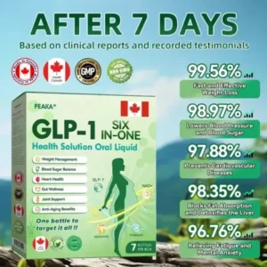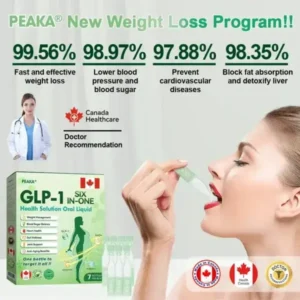 Peaka® GLP‑1 SIX‑IN‑ONE Health Solution Oral Liquid is a clinically endorsed, GMP‑certified, Health Canada (HC)-approved daily oral supplement combining GLP‑1 (Tirzepatide), NAD+, and botanical elements like moringa, turmeric, and apple cider vinegar. Created by international specialists in endocrinology and diabetology, it’s a safe, science-based solution for weight loss, metabolic support, blood sugar control, and overall wellness.