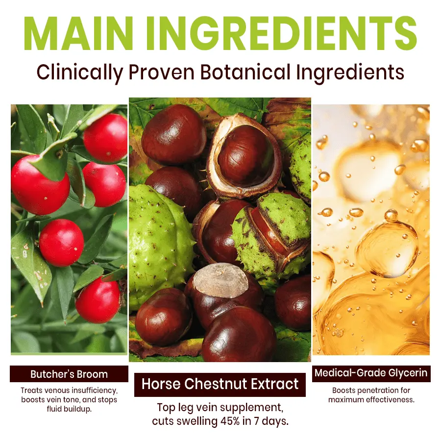 Horse Chestnut Extract: The only widely accepted supplement for leg vein symptoms. Reduces swelling and inflammation by up to 45% within 7 days.