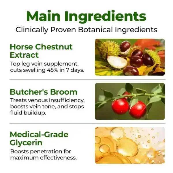 Horse Chestnut Extract: The only widely accepted supplement for leg vein symptoms. Reduces swelling and inflammation by up to 45% within 7 days.