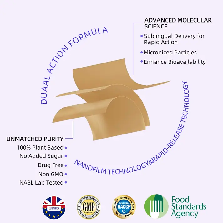 The application of nanofilm technology in GABA+GLP-1 Slimming Oral Strips mainly lies in the fine structure of the film and the microparticulation process. By encapsulating active ingredients such as GABA and GLP-1 in ultra-thin nanofilms, the bioavailability of these ingredients is greatly enhanced, ensuring they are absorbed by the body in a short time.
