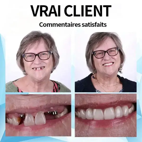« J’ai récemment consulté mon dentiste, qui m’a recommandé des implants dentaires coûteux pour réparer mes prothèses dentaires mal ajustées. Le coût était exorbitant et je me sentais désespérée jusqu’à ce que je découvre le kit de prothèses dentaires Mresio™ Silicone Reline. L’utilisation du kit de prothèses dentaires Mresio™ Silicone Reline a été la meilleure décision que j’ai jamais prise ! Il était facile à utiliser et les résultats étaient phénoménaux. Ces prothèses dentaires s’adaptent parfaitement, me donnant la confiance nécessaire pour sourire à nouveau sans gêne ni insécurité. L’ajustement confortable et ajusté a éliminé la douleur que je ressentais auparavant, et je peux manger et parler facilement. Mieux encore, j’ai obtenu ces résultats étonnants à une fraction du coût des implants. Mresio™ a vraiment renforcé ma confiance en moi et m’a évité une intervention dentaire coûteuse. Je le recommande vivement à toute personne confrontée à des défis similaires avec ses prothèses dentaires ! » – Maria Clarke