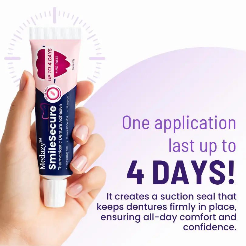 Unlike messy pastes or unreliable powders, Medazy™ SmileSecure is waterproof, food-resistant, and provides a secure hold for up to 4 days—no reapplication needed. Whether you’re eating, speaking, or laughing, your dentures stay firmly in place, giving you lasting confidence all day long.