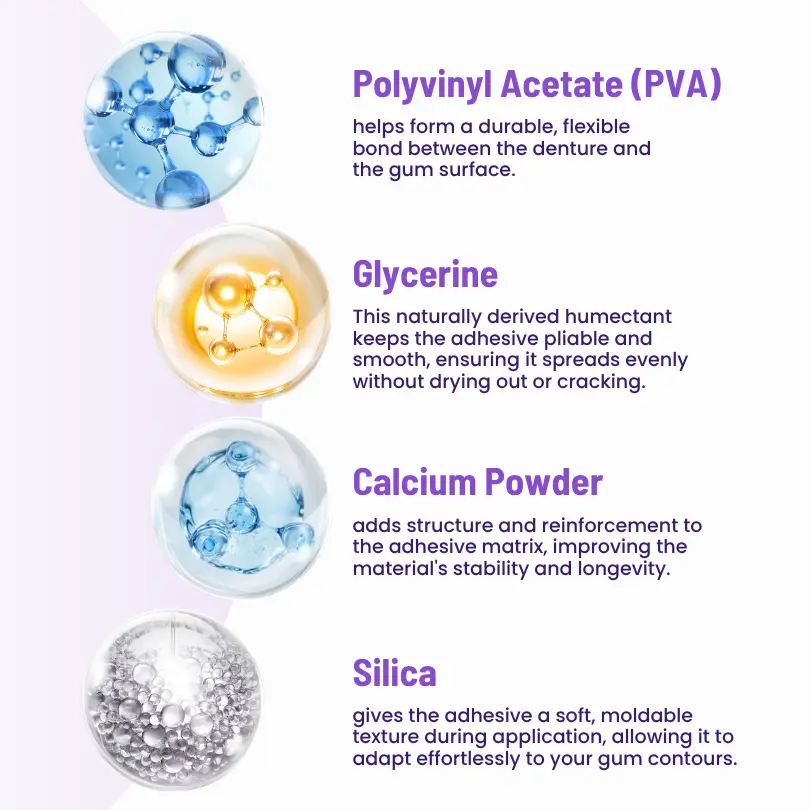 A key binding agent known for its excellent adhesion properties, Polyvinyl Acetate helps form a durable, flexible bond between the denture and the gum surface. Its thermoplastic nature allows it to soften when heated, then firm up as it cools—creating a custom-fit seal that stays in place for days.