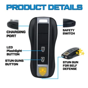 This compact car key-sized stun device delivers a jaw-dropping 77,000,000 volts – more than most mini stun gxns available today. Just firing it into the air is enough to deter most threats. If needed, its high-voltage electrodes can disable an attacker in seconds – even through thick clothing.