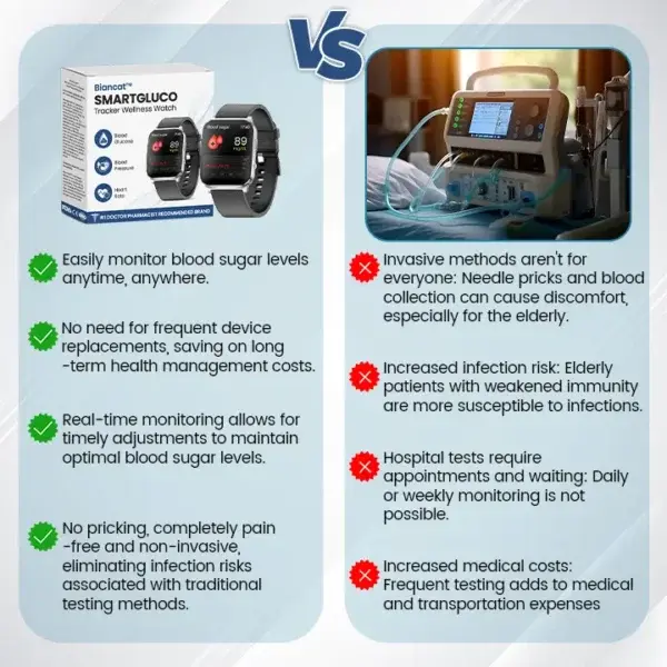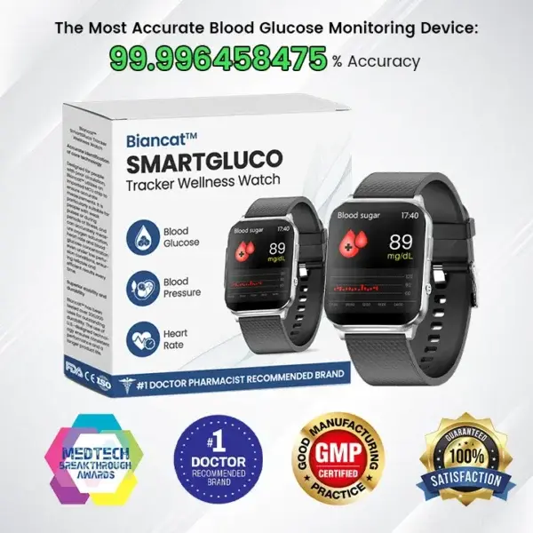 Biancat™ SmartGluco Tracker Wellness Watch is an easy-to-use device that lets you monitor your blood sugar, blood pressure, heart rate, and oxygen levels without any pain or finger pricks.